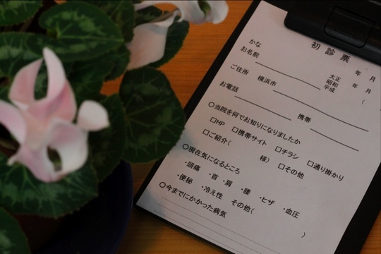 初めての方には、受付で「お体の状況確認」をお渡しします。お手数ですが、症状やお悩みなどについての簡単なアンケートへのご記入をお願いいたします。