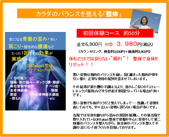 | DRTplus1整体(ディーアールティー・プラスワン) 短時間で骨盤から全身のバランスを整えます | 3,900円 |